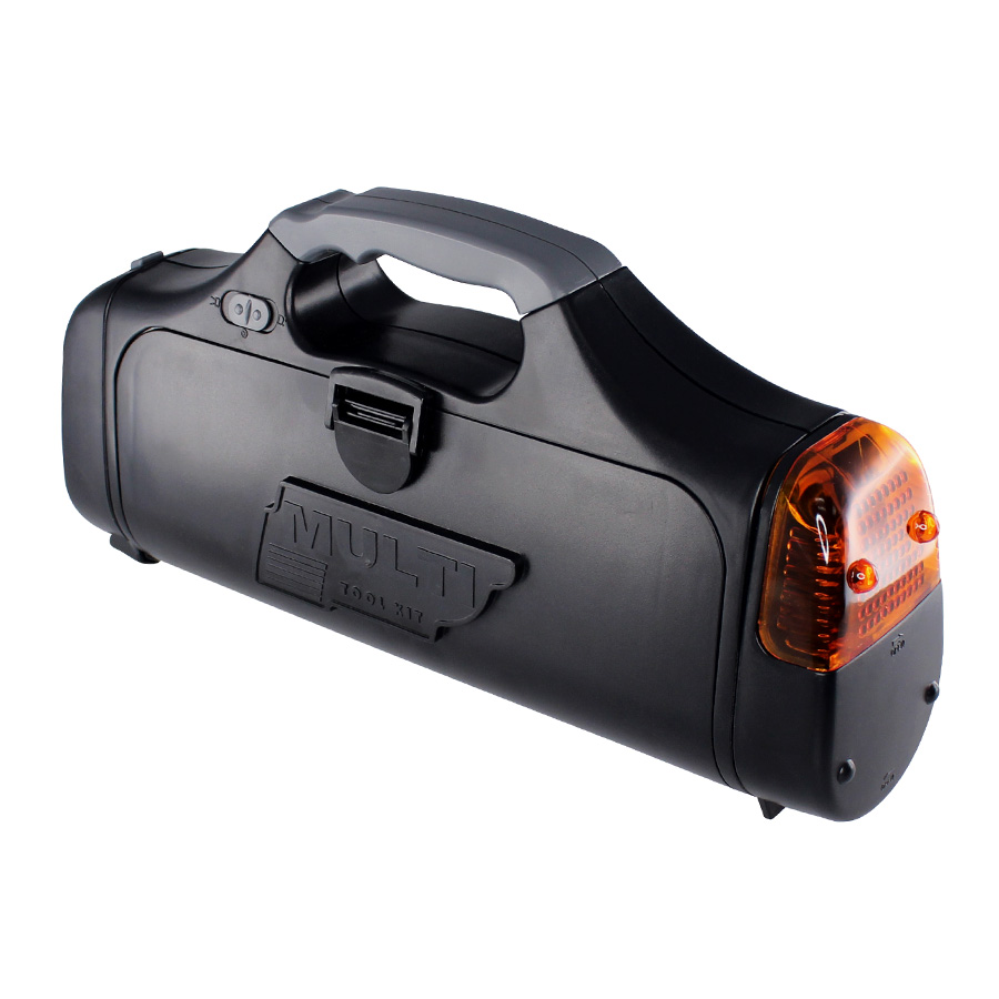 Kit de Emergencia para el Vehículo en plástico ABS negro. Incluye 13 Herramientas, Linterna, Luz naranja intermitente, 2 focos reflectantes redondos rojos y un cargador para conexión al encendedor del vehículo.