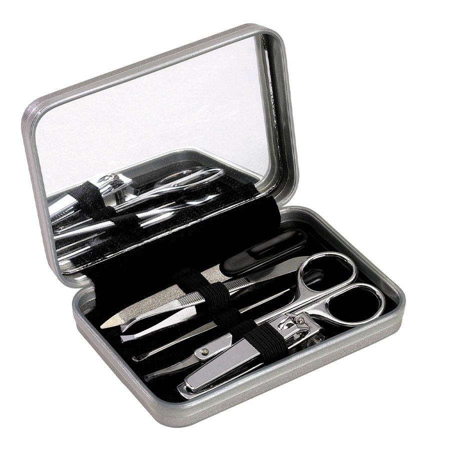 Set de Viaje y Manicure en Caja Metálica con Espejo y cierre imantado.