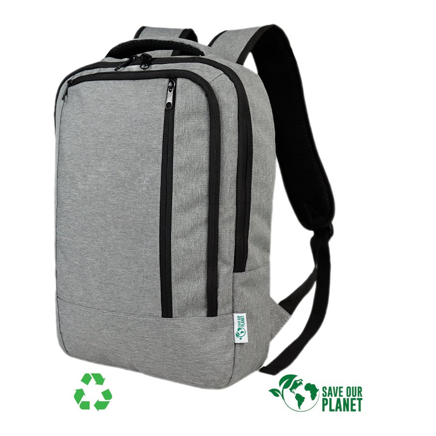 Mochila Porta-Notebook modelo "ECO". Fabricada en material reciclado PONGEE-RPET bitono, eco-cuero 210D/PU y poliéster 300D/PU. Capacidad 12.5 litros, tamaño 30 x 41.5 x 10 cm. Incluye compartimento interior reforzado y acolchado para Laptop y doble bolsillo delantero.