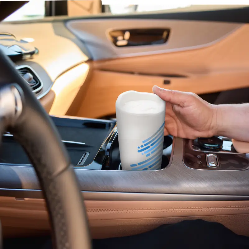 Mug confeccionado en PP, cuenta con tapa antiderrame.