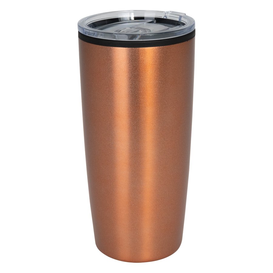 Mug metálico doble pared aislante, interior plástico PP, exterior Acero inoxidable 201 SS, recubierto con pintura POWDER COAT color cobre. Producto BPA FREE, para el contacto con líquidos y alimentos. Fondo de silicona negra ABS anti-deslizante. Tapa removible de plástico PS Crystal Clear con sello cilíndrico de silicona. Capacidad 600ml. Presentación en bolsa PP + caja de regalo de cartón negro.