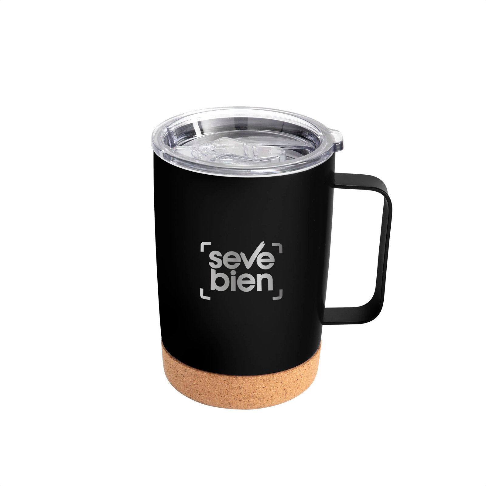 Diseño elegante con base de corcho.Mug doble pared con asa, sellado al vacío. Mug con aislamiento térmico. Tecnología vacuum. Interior en acero 304 y exterior en acero 201. Tapa de poliestireno con anillo de silicona. Asa metálica. Base de corcho. Pintura acabado semi mate. Mantiene hasta 6 hs la temperatura de las bebidas calientes y hasta 10 hs la de las bebidas frías.Medidas: Ø 8,5 cm x 13 cm. (no incluye asa)