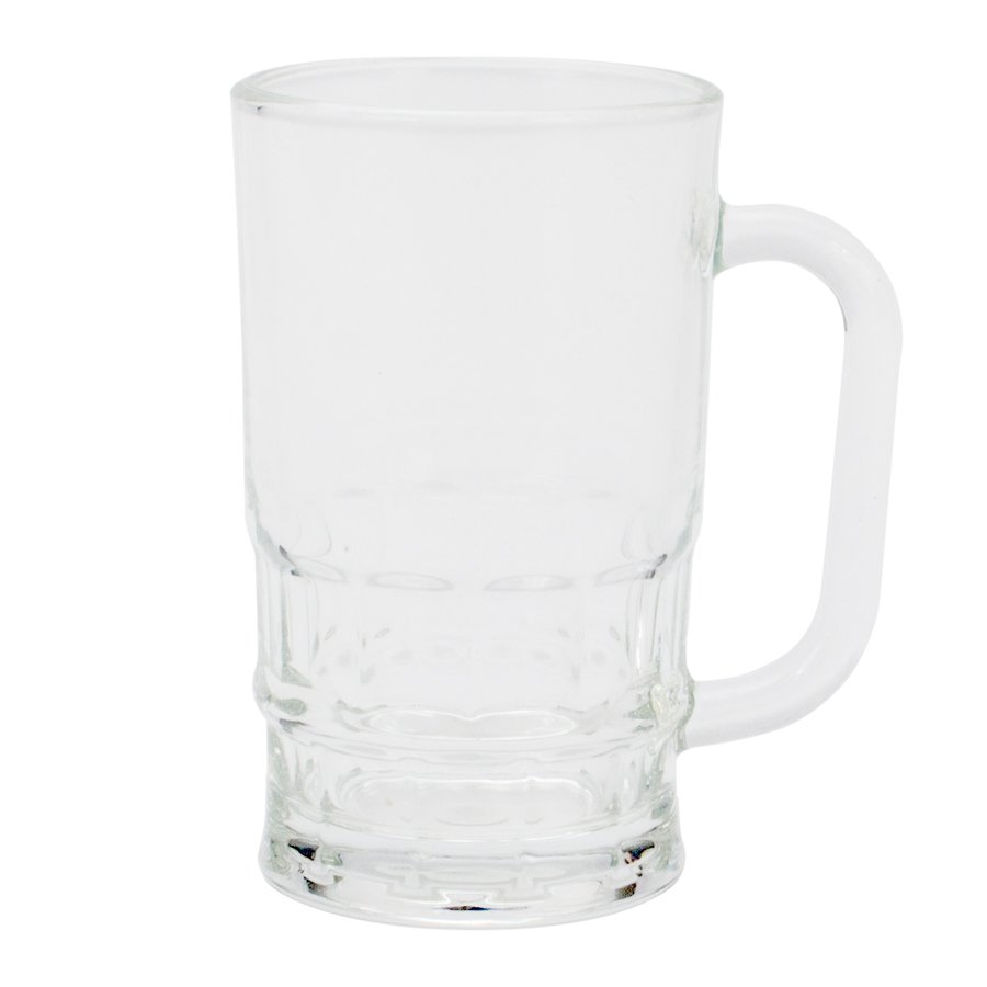 Tazón Cervecero de Vidrio, para Sublimación, para líquidos fríos, con asa. Capacidad 300ml. Presentación bolsa plástica empavonada + caja de cartón blanco. Calidad Premium ORCA.
