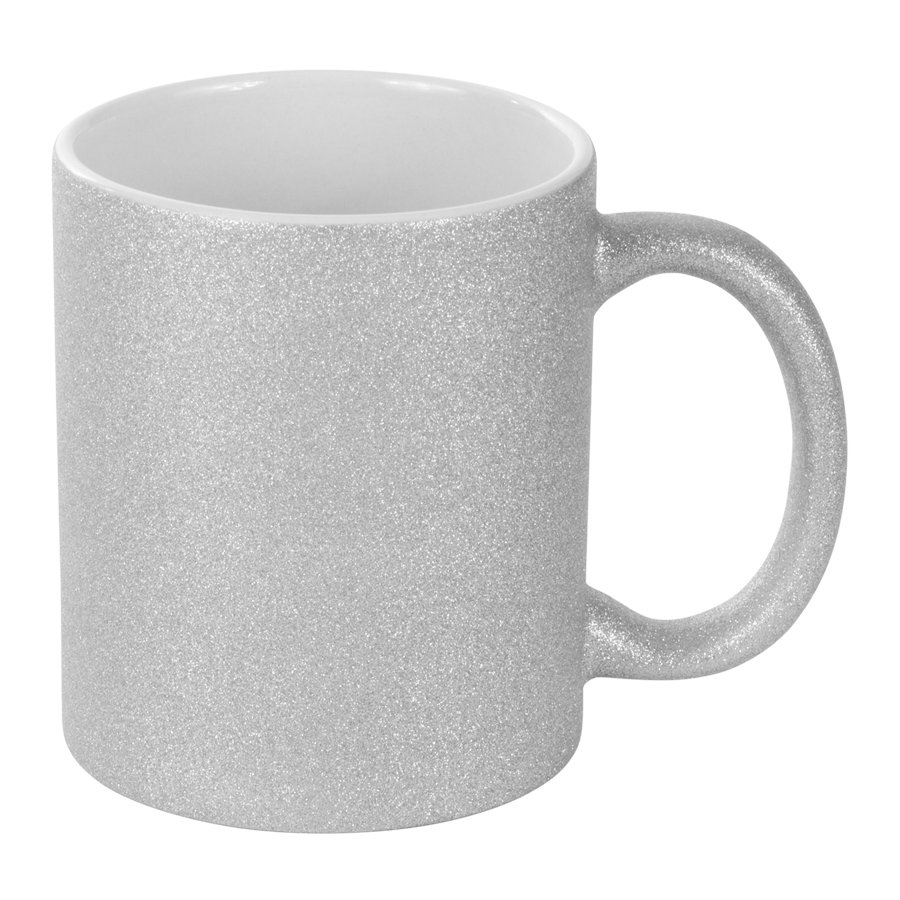 Tazón cerámico de 350cc. con superficie exterior glitter plateado, para Sublimación. Incluye caja blanca de Cartón color plata.