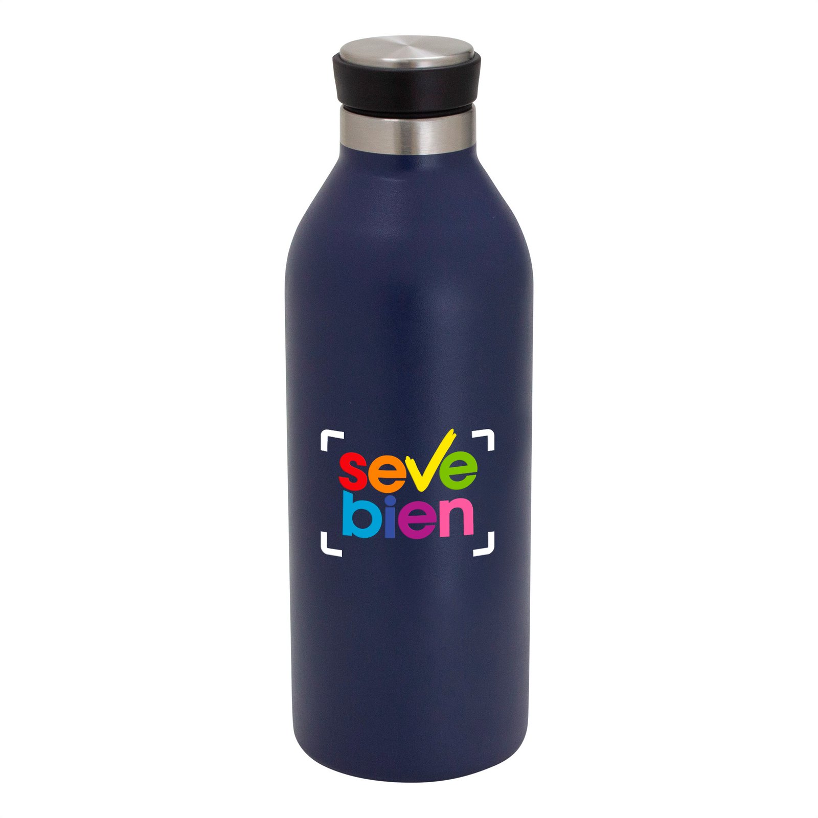 Ø 7,2 cm x 21,5 cm. Capacidad 500 ml. Acero inoxidable. Botella doble pared, sellada al vacío. Interior en acero 304 y exterior en acero 201. Pintura acabado mate. Tapa de polipropileno, acero inoxidable 201 y anillo de silicona. Mantiene hasta 8 hs la temperatura de las bebidas calientes y hasta 12 hs la de las bebidas frías. Presentación en caja de regalo kraft.