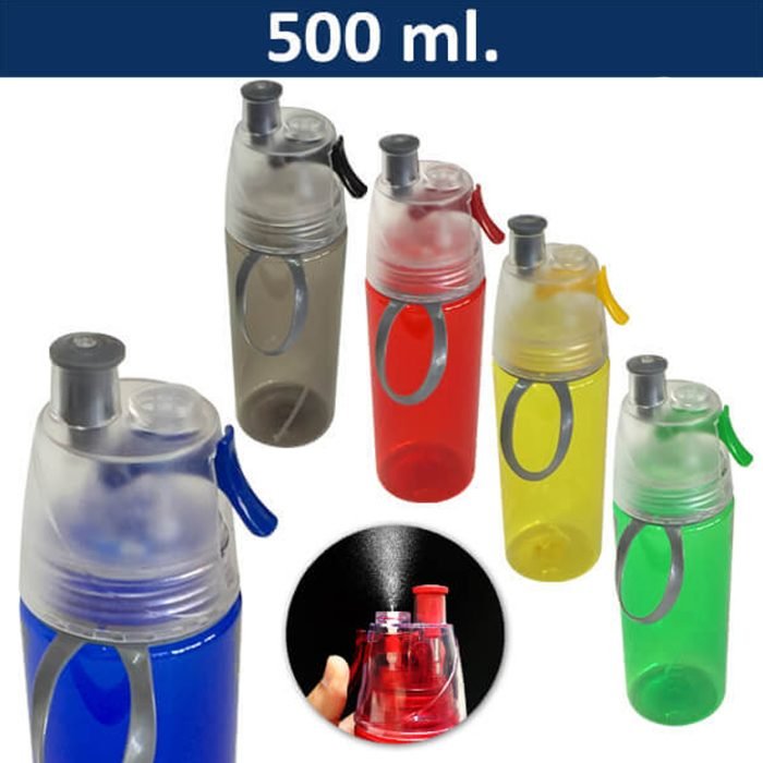 M24 Botella con rociador en distintos colores. Boquilla y asa de transporte en color gris. Asa removible. Presentación en bolsa plástica. Libre de BPA. Incluye silicona antiderrame. Tamaño Ø 7 cms. x 24 cms. Capacidad 500 ml. Material AS Embalaje 1 Unid. Embalaje Master 96 unid. Tamaño Caja Master 6…