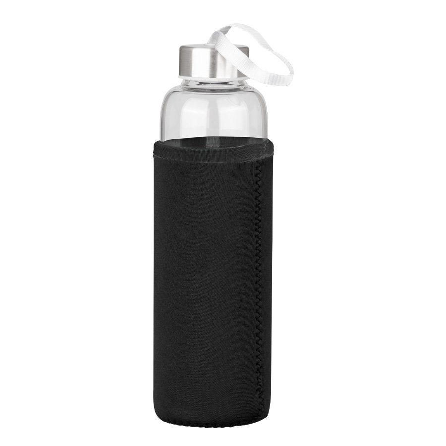 Botella cilíndrica de Borosilicato de alta resistencia. Incluye tapa rosca de Acero inoxidable y cinta lanyard colgante de polipropileno (PP) color plata en su parte superior. Cuenta con una práctica funda removible de tela Neopreno aislante en colores, para una mayor protección contra golpes y temp…