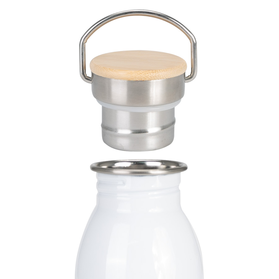 Botella blanca con cuerpo blanco para sublimación, de una sola pared de Acero inoxidable 304 SS. Producto BPA FREE, para el contacto con líquidos y alimentos. Tapa rosca de Acero inoxidable 304 SS y bamboo, con gancho de sujeción de Acero inoxidable 304 SS. Capacidad 750ml. Presentación en bolsa plá…