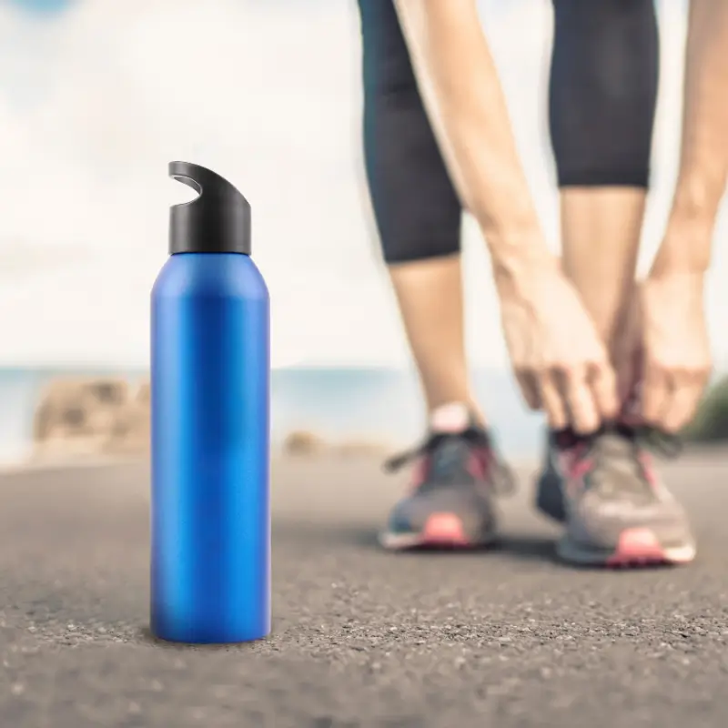 Sport Bottle reutilizable de aluminio con tapa rosca de PP y silicona. Cuenta con una tapa con agarre para facilitar su transporte.