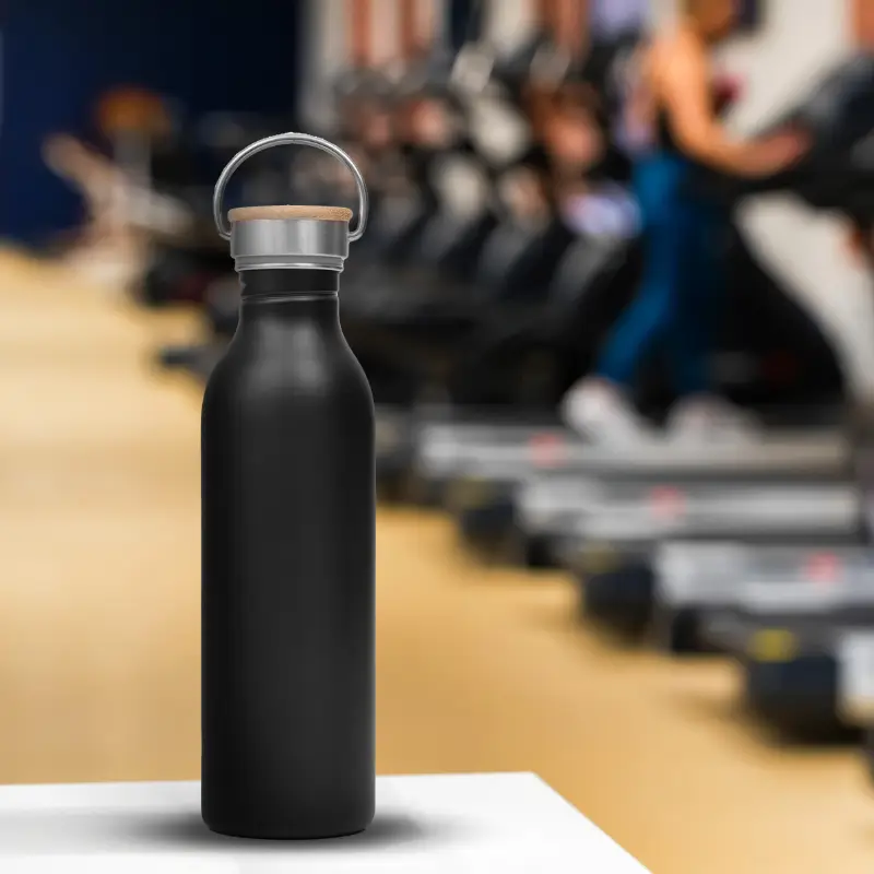 Sport Bottle reutilizable de acero inoxidable AISI 304, con tapa rosca de bambú y gancho de agarre. Producto libre de BPA. Medidas: 25 cm x diámetro 7 cm. Capacidad: 700 ml.