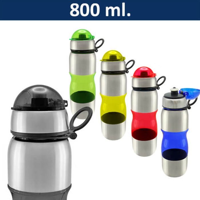 M25 Caramayola de acero inoxidable y detalles plásticos en distintos colores. Tapa removible del mismo color de la botella. Presentación en bolsa plástica dentro de caja negra. Presentación en bolsa plástica. Incluye silicona antiderrame. Libre de BPA. Tamaño Ø 7,2 cms. x 26,5 cms. Capacidad 800 ml.…