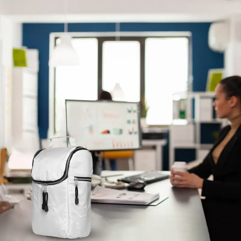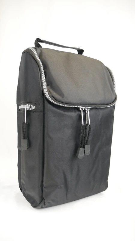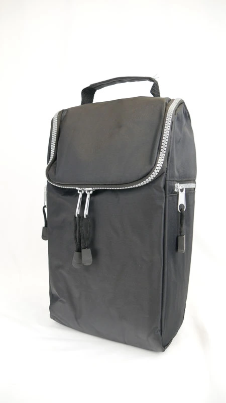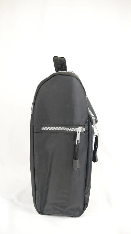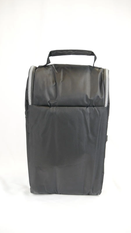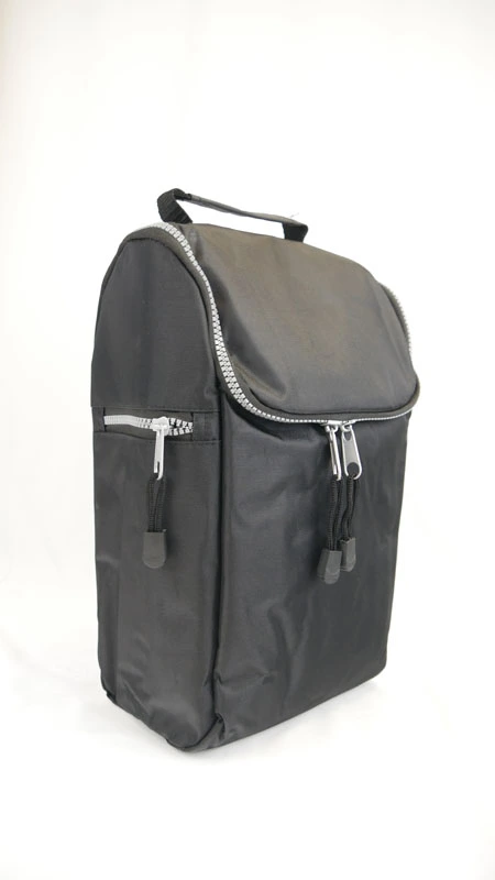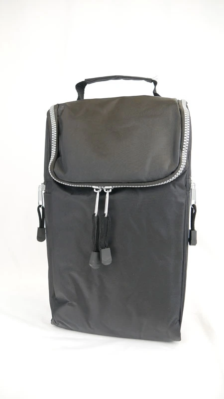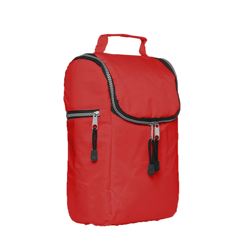 Cooler confeccionado en tela Nylon 600D, interior térmico forrado en PVC gris. Bolsillos laterales. Apto para llevar botellas, termos y otros.