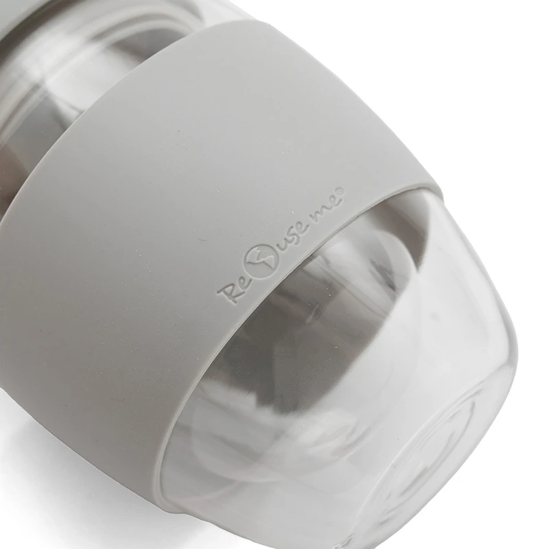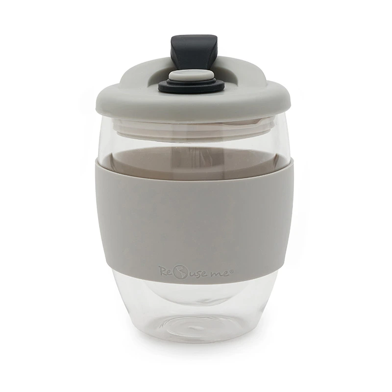 Mug reutilizable confeccionado en vidrio de doble pared de borosilicato. Gracias a su doble pared, no transmite el calor de la bebida a la manos. Cuenta con tapa con boquilla con cierre a presión y banda de silicona gris antideslizante personalizable. Capacidad: 350 ml. Medidas: 14,5 x 8,5 (Altura x…