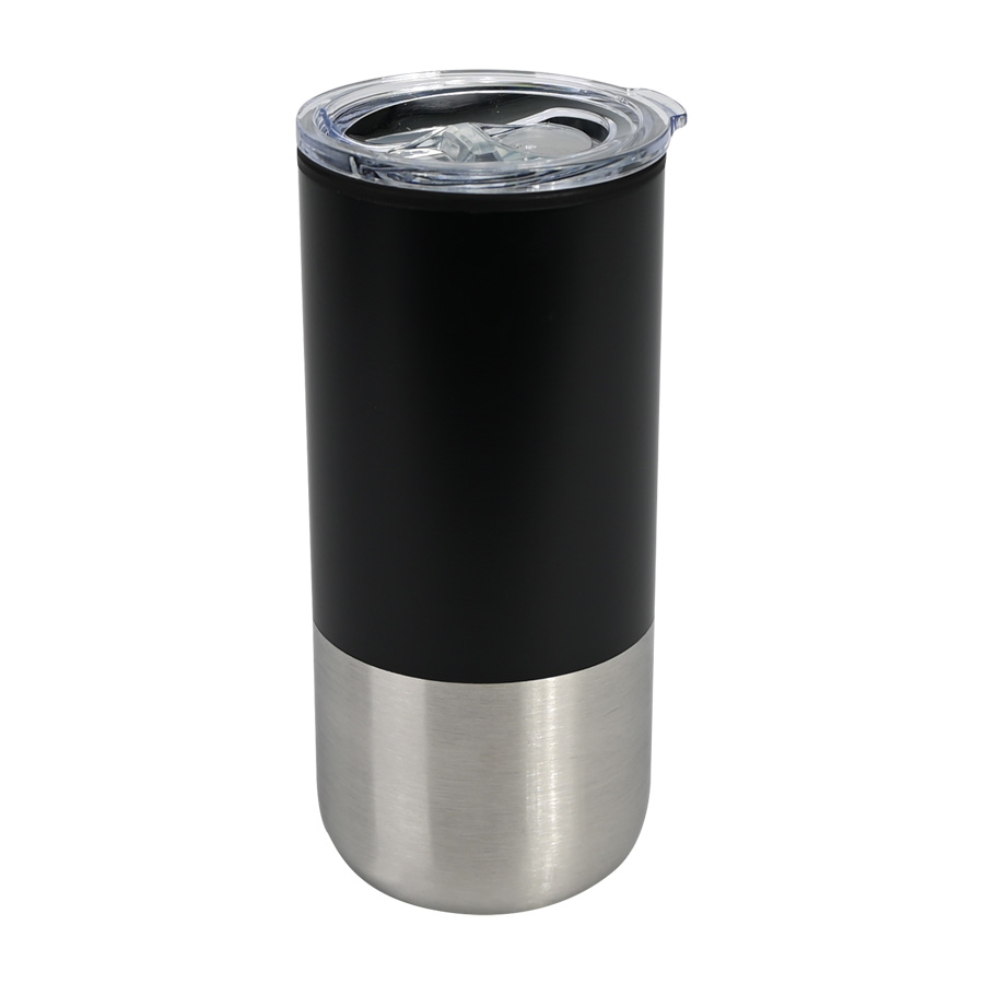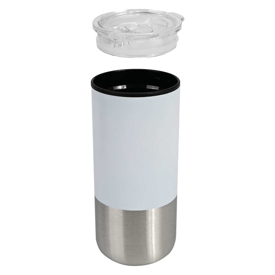 Mug metálico bicolor doble pared aislante, interior plástico PP, exterior plástico PP con pintura POWDER COAT, combinado con Acero inoxidable 201 SS, modelo "THEO". Producto BPA FREE, para el contacto con líquidos y alimentos. Fondo de silicona negra ABS anti-deslizante. Tapa removible de plástico P…