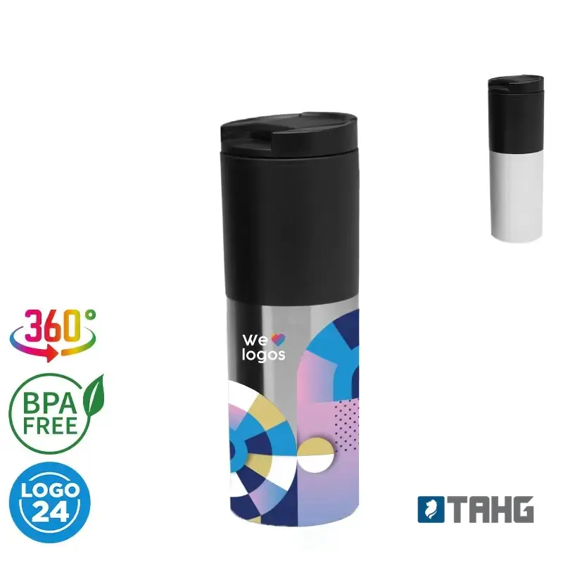 Mug térmico realizado con aluminio e interior de polipropileno negro. Boquilla regulable. Doble pared plástica. Packaging: Caja Impresa. Medidas: 22 cm x Diámetro 7,5 cm. Interior realizado en plástico. Capacidad: 450 ml. Producto libre de BPA. LOGO24: Producto disponible para el servicio de logueo…