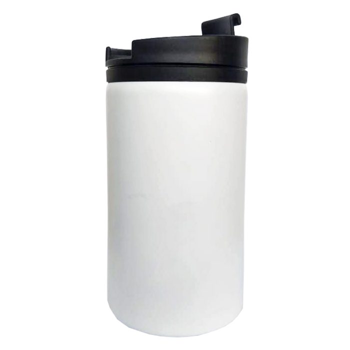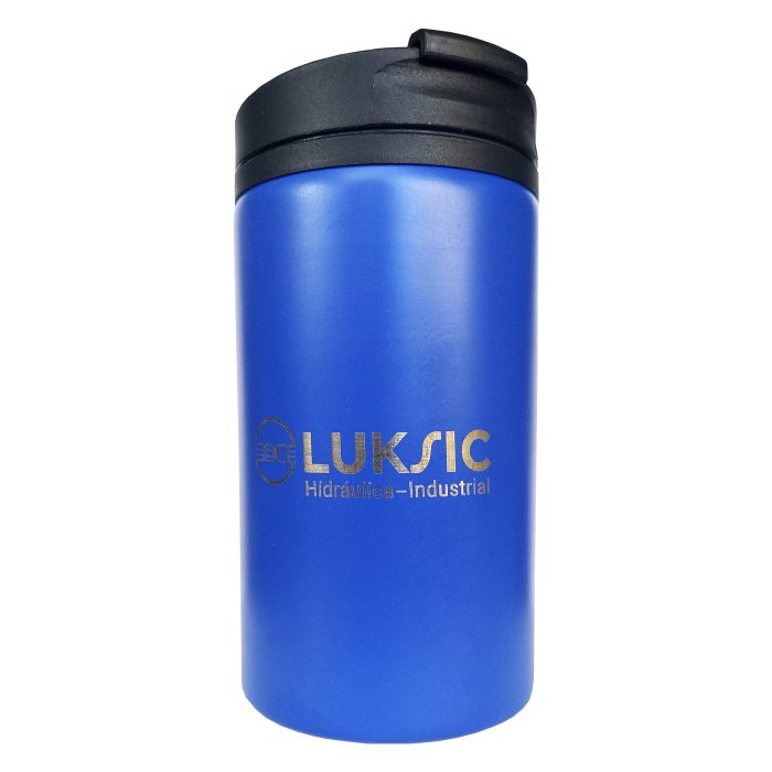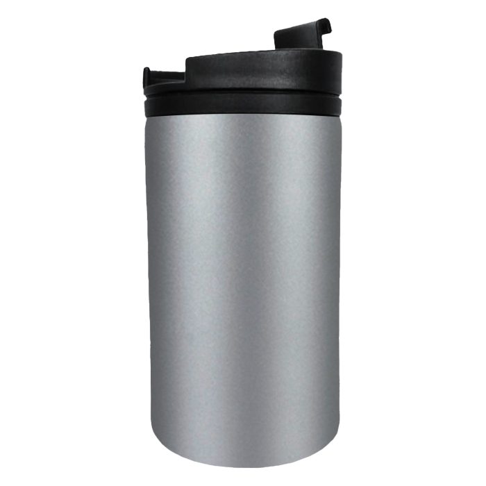 M14 Atractivo mug metálico/plástico con tapón de rosca anti derrame de plástico sólido. Presentación caja individual color Negra. Doble pared aislante, tapa rosca con dosificador, incluye silicona antiderrame. base antideslizante. Tamaño Ø 7.3 cms. x 14.5 cms. Capacidad 300 ml. Material Exterior Ace…