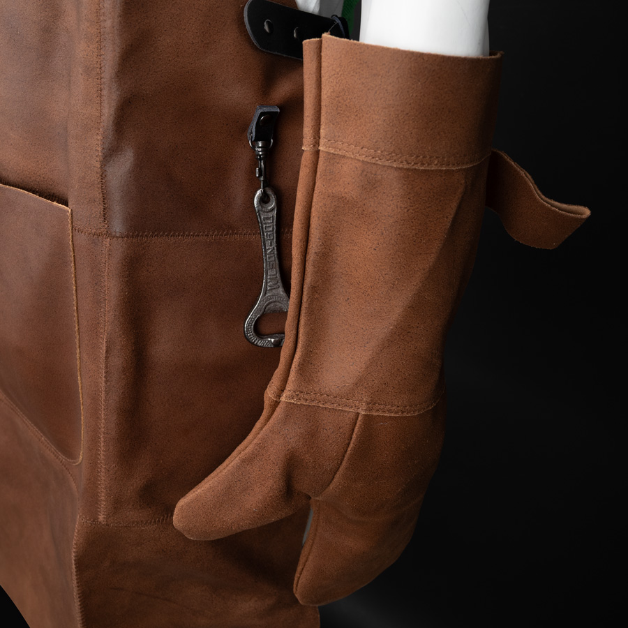 Un regalo fuera de serie. Deluxe set de Asador, contiene Pechera de Asador BBQ en Cuero engamuzado 100% genuino color café cognac, con cintas y rectángulo de 8 x 5 cm. de Cuero 100% genuino color negro. Argolla, destapador y remaches de acero envejecido y bolsillo delantero de 20 x 21 cm. Contiene a…