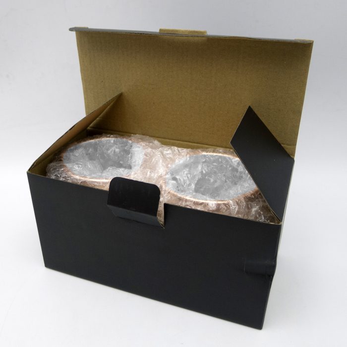 M76 Set de 2 tazones de acero inoxidable electro plateados en cobre con puntos martillados y asa de Zamak. Presentación en caja de cartón negra. Tamaño Ø9,3 x 10 x 11,8 cms. Capacidad 500 ml. Material Acero Inox. SS 304 Embalaje 1 unid. Embalaje Master 50 unid. Tamaño Caja Master 54,5 x 22,5 x 55 cm…
