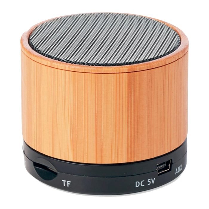 SK53 Compacto parlante con cuerpo en bambú/bamboo y conexión Bluetooth® con 3W de potencia, función manos libres y base antideslizante. Tiempo de carga una hora, tiempo de uso tres horas, distancia de uso 10 metros. Presentación en caja de cartón kraft. Incluye Cable USB Tamaño Ø 5 x alto 6 mm. Mate…
