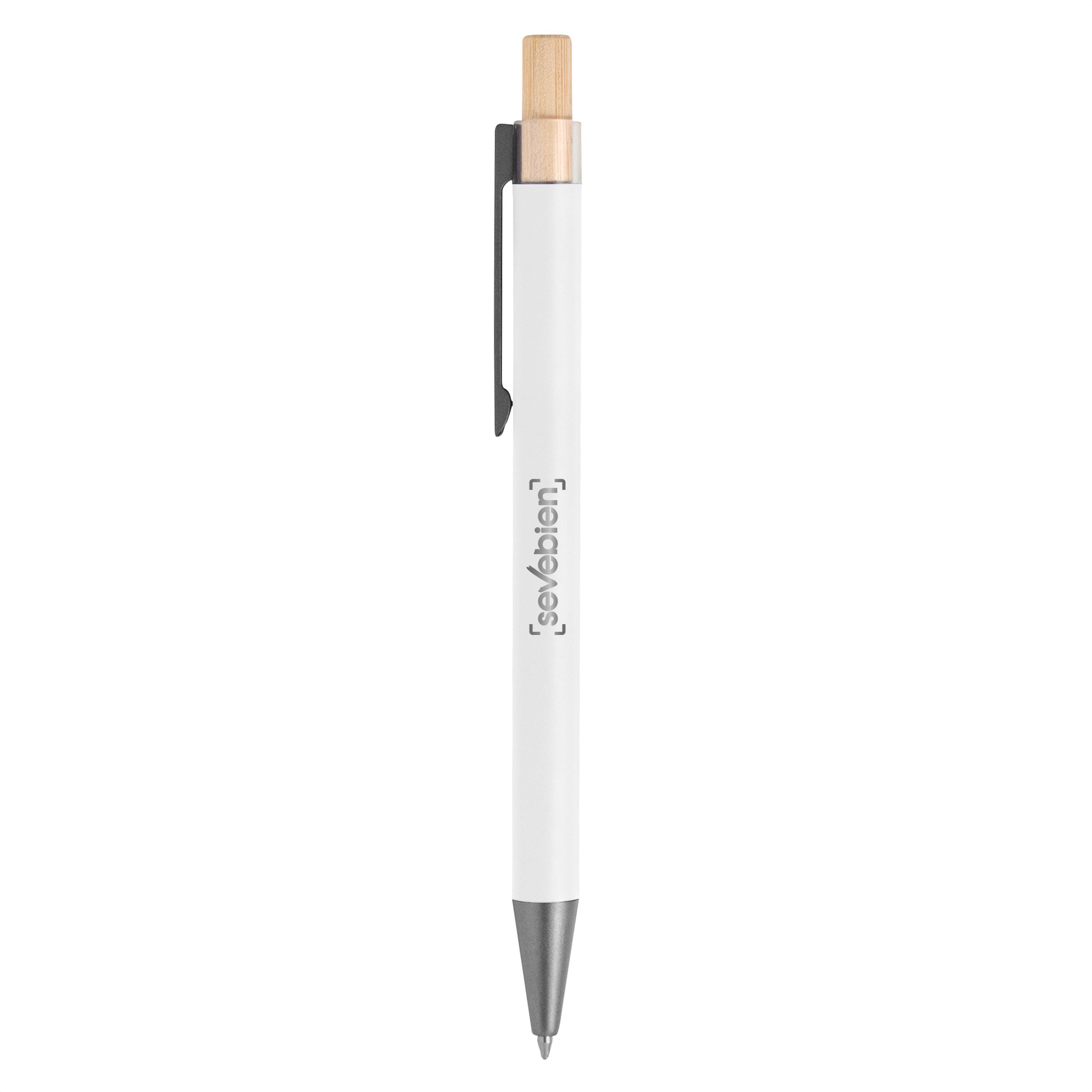 Aluminio y bambú. Bolígrafo retráctil. Cuerpo metálico en diferentes colores acabado mate. Clip metálico y puntera plástica color gris acabado mate. Pulsador de bambú. Tinta negra.
