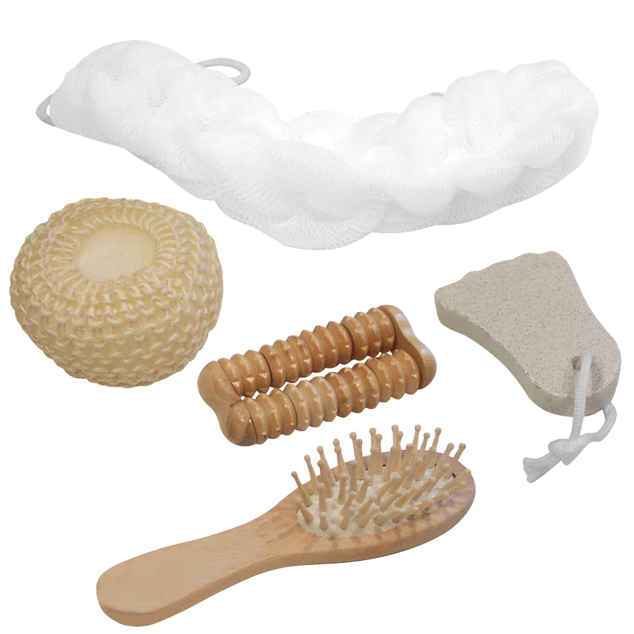 Canasto SPA de belleza en madera modelo "Naturals". Contiene cepillo de pelo, esponja malla, masajeador de madera, piedra pomez y esponja de masaje corporal.