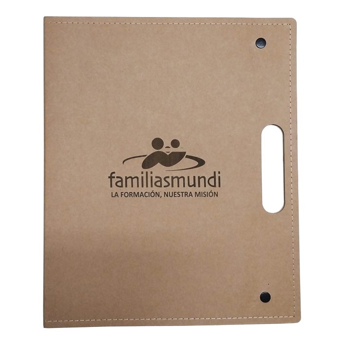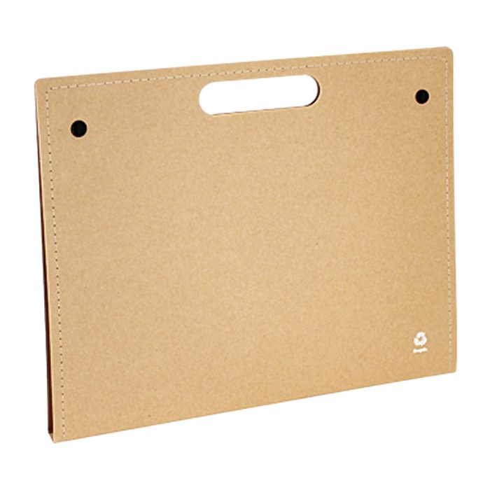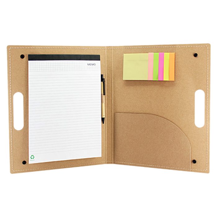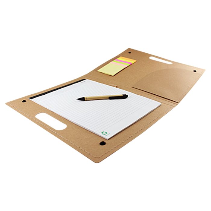 N55 Carpeta tipo maletín ecológico de cartón reciclado con cierres y bolsillo interior. Incluye block de notas A4 de 20 hojas, 1 block de notas adhesivas de 25 hojas pequeñas, 5 blocks de 25 banderitas adhesivas, bolígrafo ecológico, tinta azul. Tamaño 34 cms. x 28 cms. Material Tapa Cartón Reciclad…