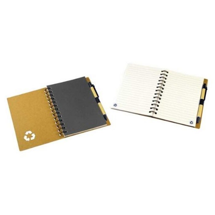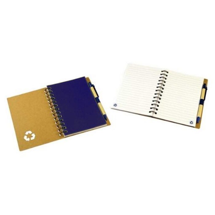 N49 Libre ecológica con signo de reciclaje calado. Primera hoja de color. Incluye bolígrafo ecológico. Tapa marcada con signo reciclaje 70 Hojas de 70 Grs. Bolígrafo tinta azul. Tamaño 14 cms x 17,8 cms x 1,2 cms. Material Tapa Cartón de 900 grs. Papel Marfil con líneas Embalaje 40 Unid. Embalaje Ma…