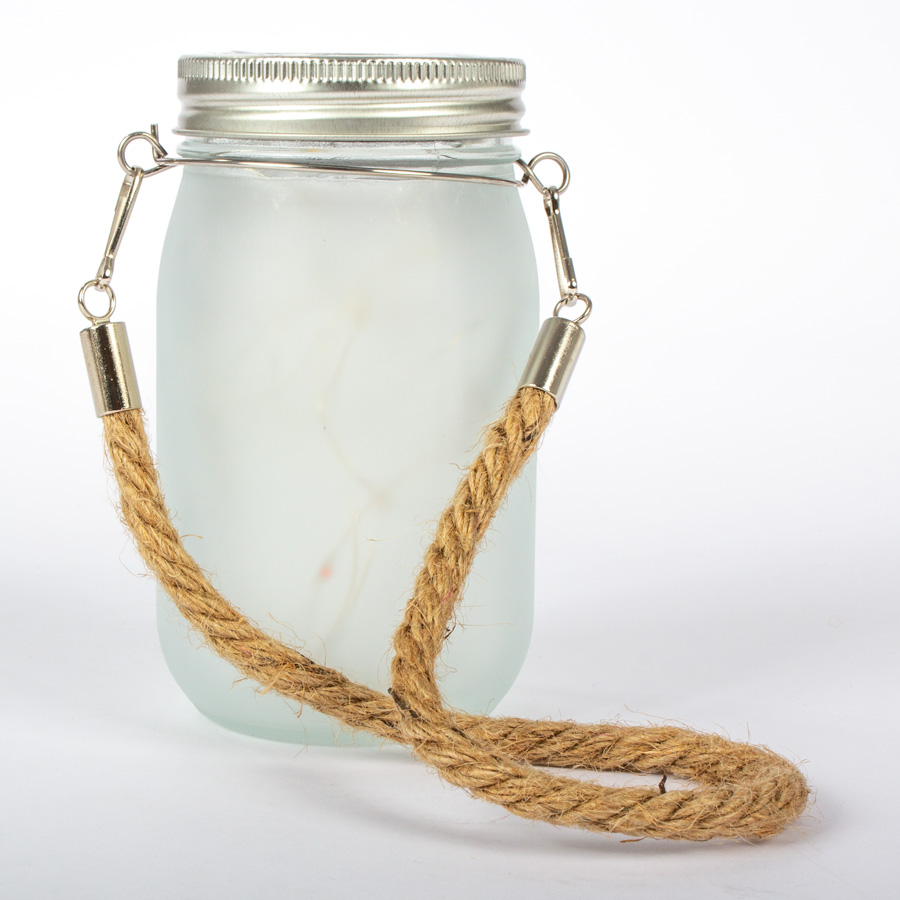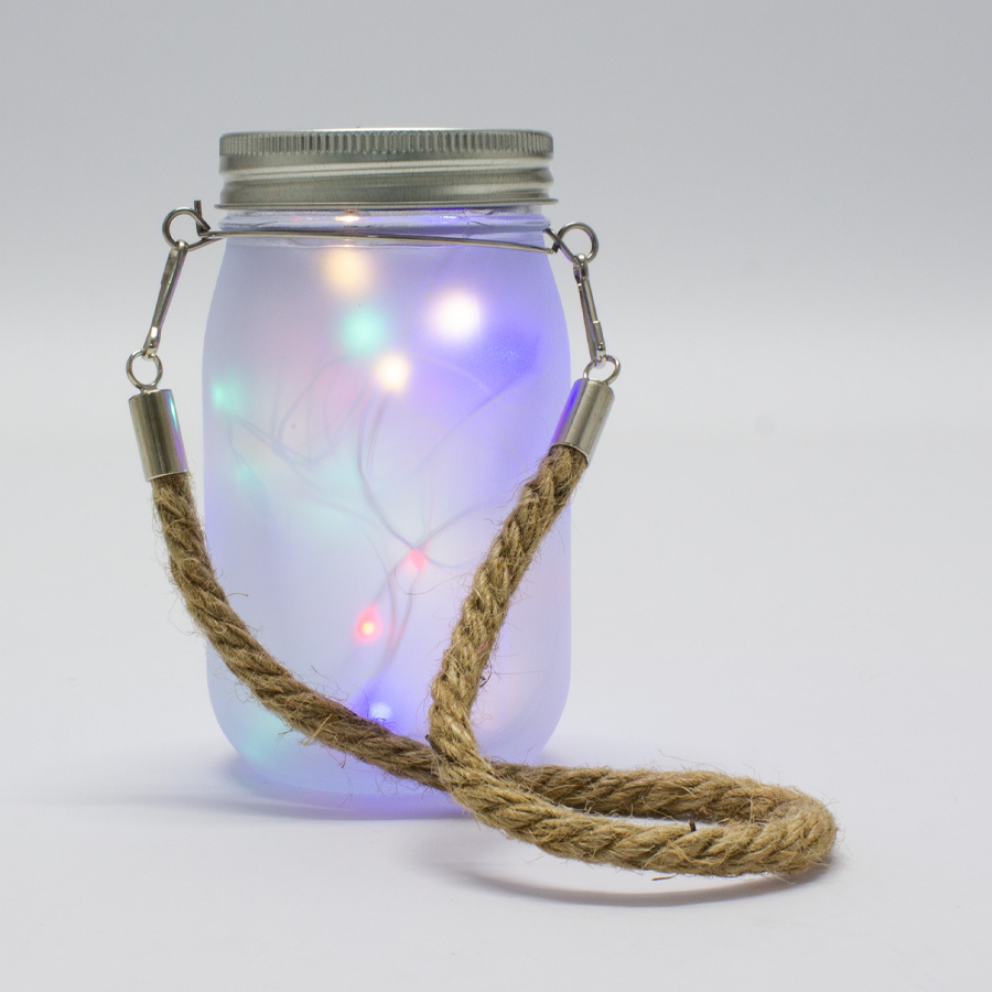 Farol para colgar, con forma de frasco y con tapa. Incluye cable con luces LED en el interior, que cambian de color. Sobre la tapa, contiene panel fotosensor, que permite que las luces LED se enciendan automáticamente cuando baja la luz-día. Las luces permanecerán encendidas por un lapso de 3 horas …