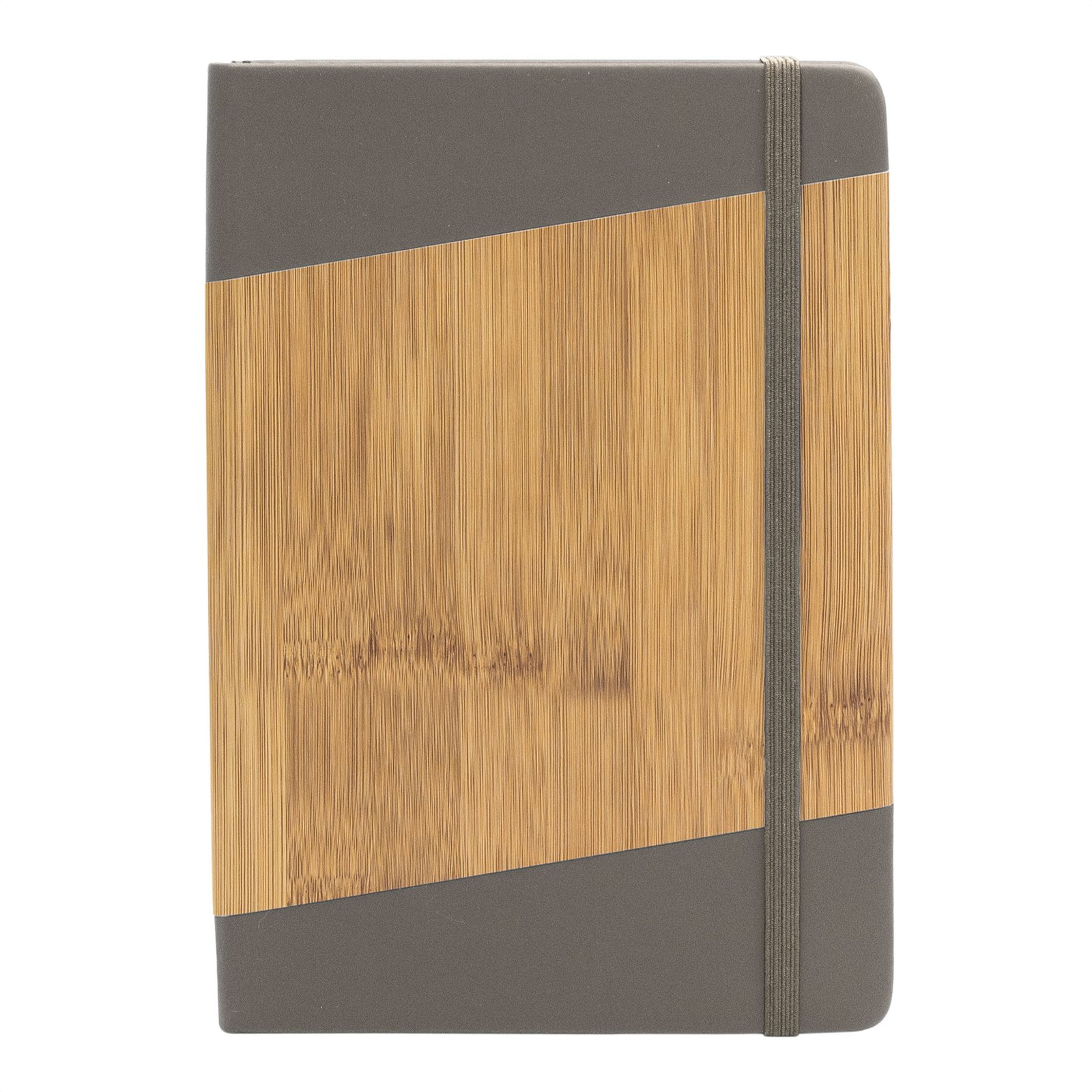 21 x 14 cm. (A5). PU + Papel. Libreta. Tapa dura recubierta en poliuretano, con estampado simil bambú. Interior 80 hojas rayadas en papel de 70 g. Cinta señaladora y cierre con banda elástica del mismo color.