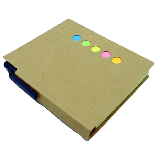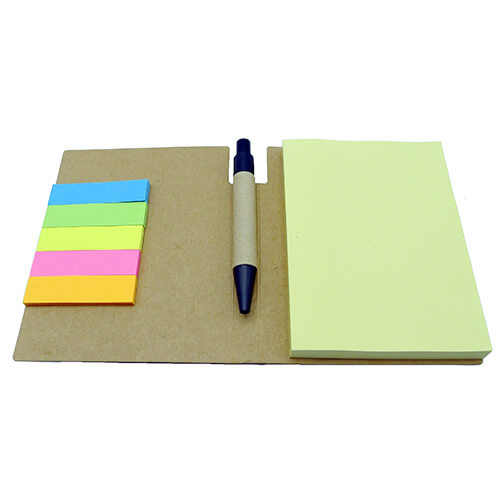 N11 Memo set ecológico de oficina que incluye set de post-it y bolígrafo ecológico pequeño, tinta azul. Tapa plegable con orificios. Bolígrafo ecológico pequeño con terminaciones negras. 125 Post-it rectangulares y 80 bloc de notas. Tamaño 10,5 cms. x 12 cms. x 1,5 cms. Material Tapa Cartón Embalaje…
