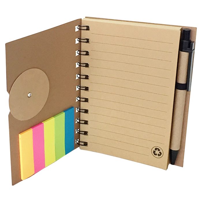 N21 Memo set ecológico libreta con anillado doble cero metálico y marcador de día. Incluye set de post-it y bolígrafo ecológico, tinta azul. 125 Flag Post-it. 70 Hojas papel kraft lineado 70 grs, impreso signo reciclaje. Tamaño 11cms. x 14,5 cms. x 1,5 cms. Material Tapa Cartón Kraft Embalaje 50 uni…