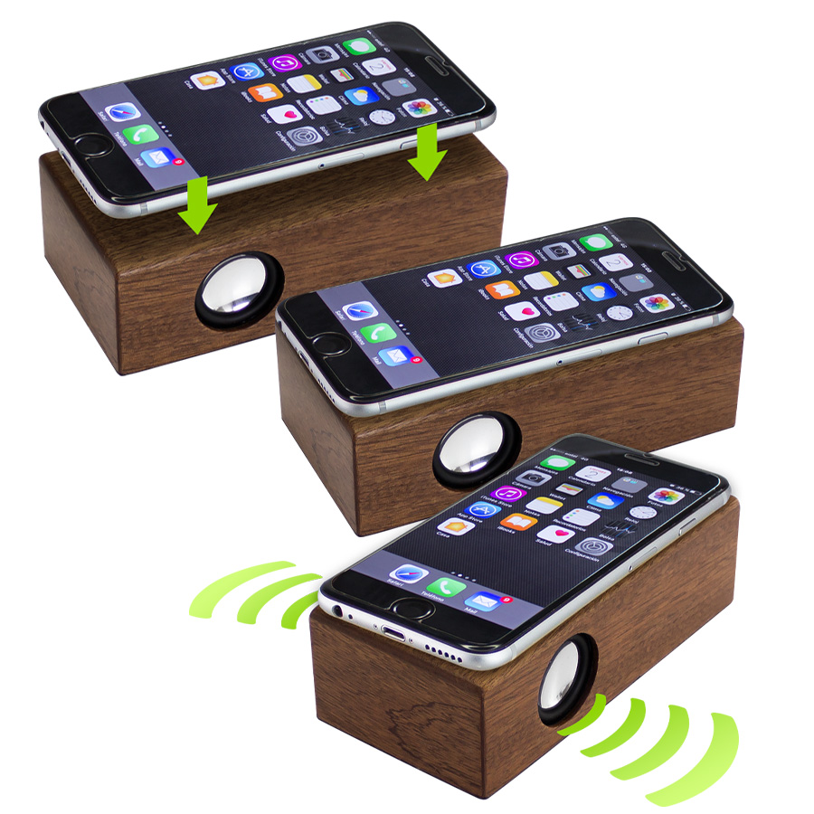 Parlante amplificador de sonido por Inducción, tamaño grande, de madera barnizada de Nogal. Ahora con mayor potencia y mejor calidad de sonido!! No necesita Bluetooth, Wi-Fi o conexión a cable. Amplifica el sonido una vez que se posa el celular sobre él, con un efecto de caja de resonancia. Compatib…