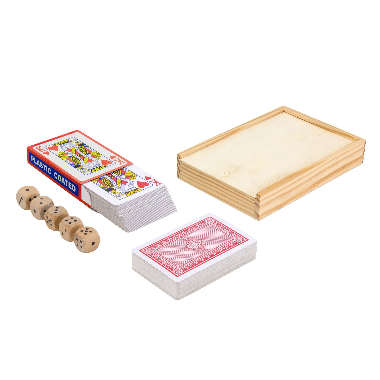 15 x 10,3 x 2,7 cm. Madera y papel plastificado. Set de entretenimiento. Incluye: 2 juegos de cartas de poker plastificadas y 5 dados de madera de cerezo. Caja contenedora de madera de pino y tapa deslizable en polywood. Presentación en caja de regalo kraft.