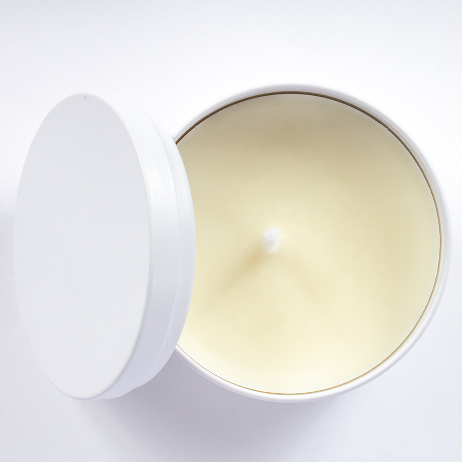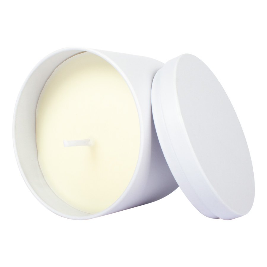 Vela aromática de 8oz en envase redondo de aluminio con tapa. Ideal para regalo de hogar y aromaterapia. Amplia superficie de impresión de logo.
