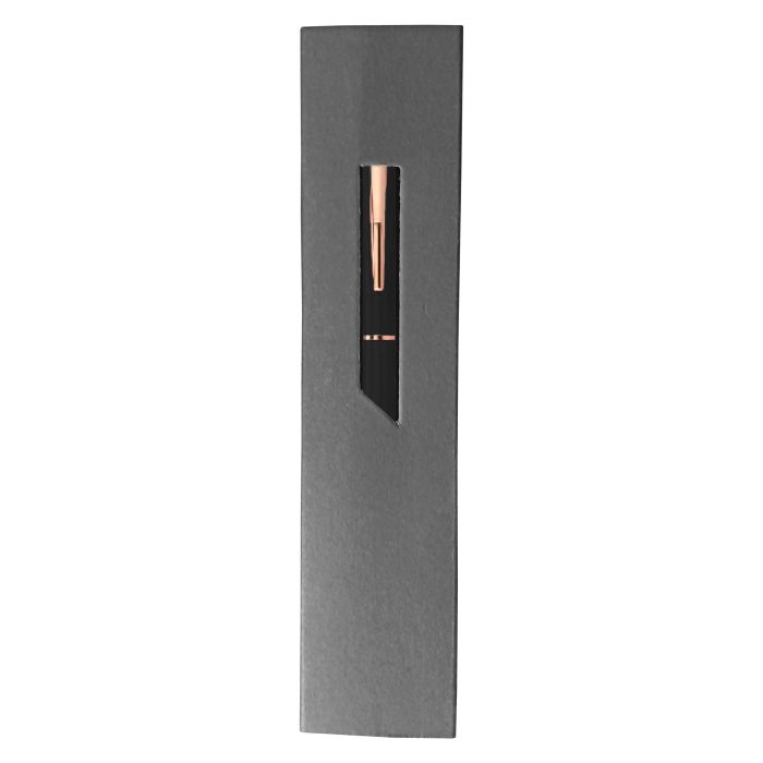 L79+B Bolígrafo metálico negro con detalles en cobre electroplateado. Apertura giratoria. Tamaño 13,5 cms. Escritura Azul. Packing 1 unidades Embalaje Master Caja de 200 unidades Tamaño Caja Master cms. Peso Caja Master Kgs. Opciones de Personalización
