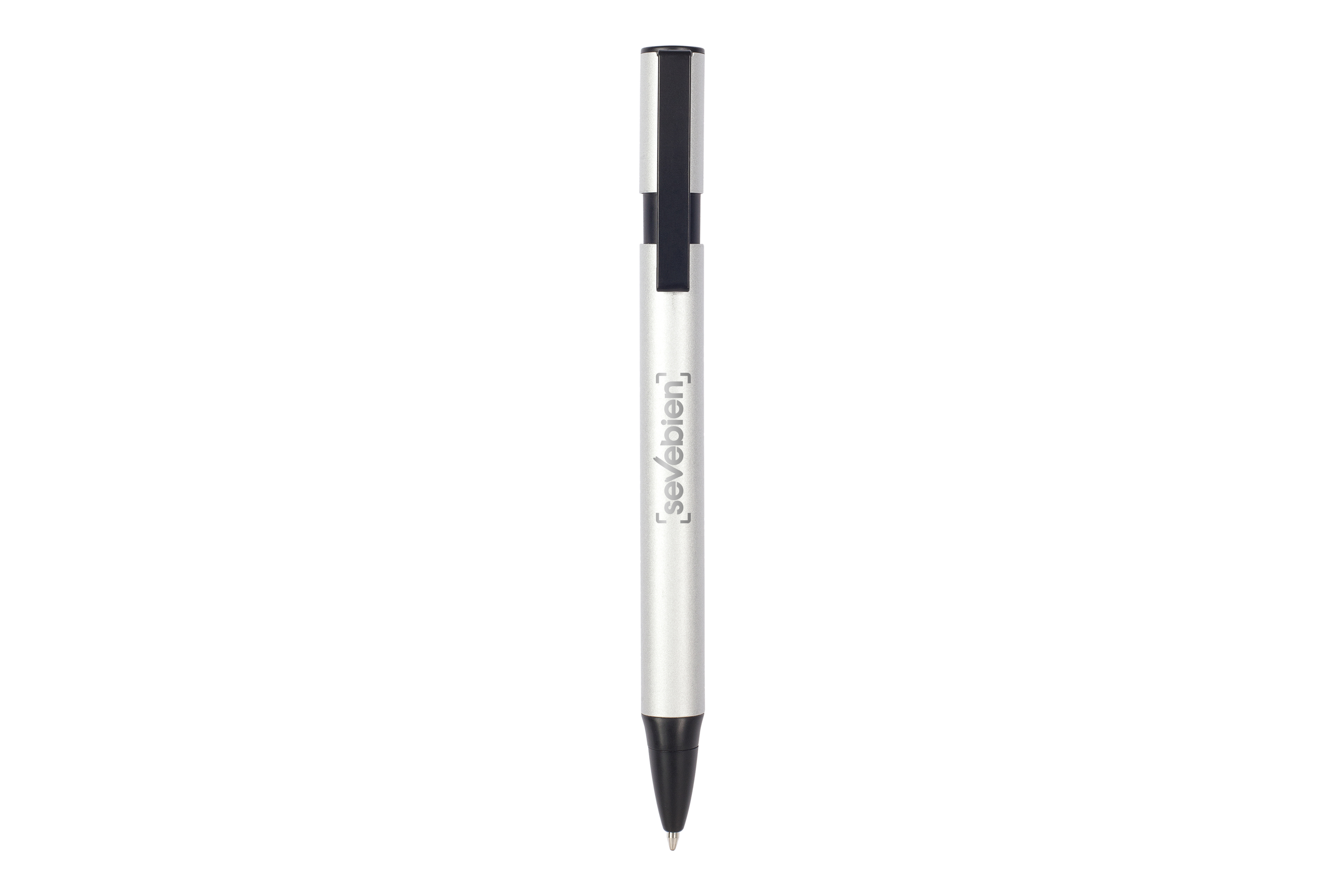 Metal. Formato ovalado. Cuerpo de color. Puntera, clip y pulsador de plástico negro. Tinta azul.
