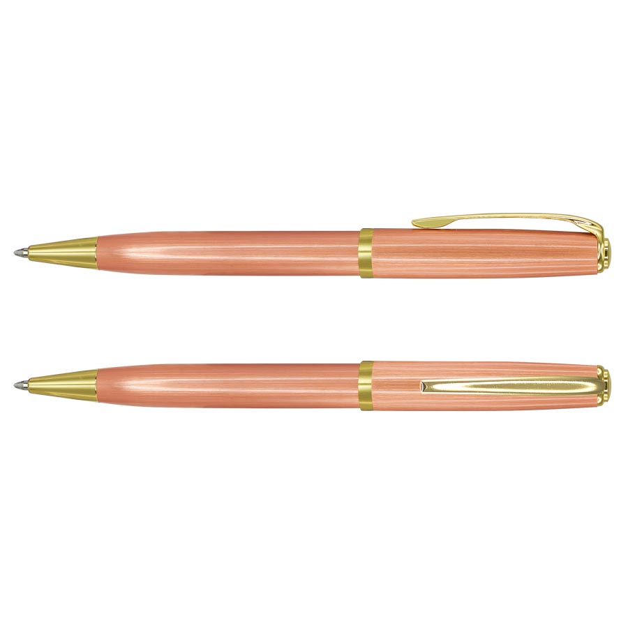 Bolígrafo Metálico Encobrizado, con terminales dorados. Escritura azul.