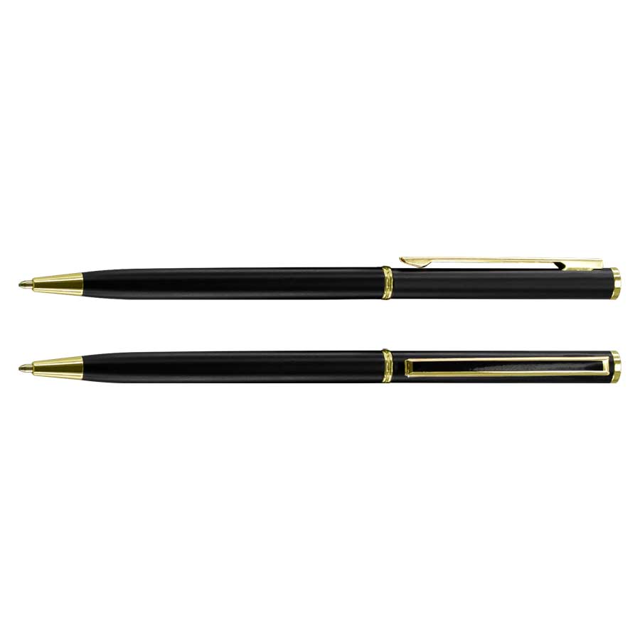 Bolígrafo Metálico negro "Tourist", con terminales dorados. Especial para el rubro Hotelería y Turismo. Escritura negra.