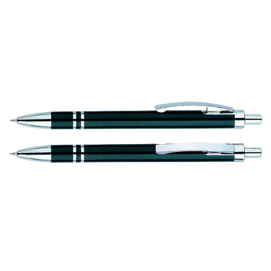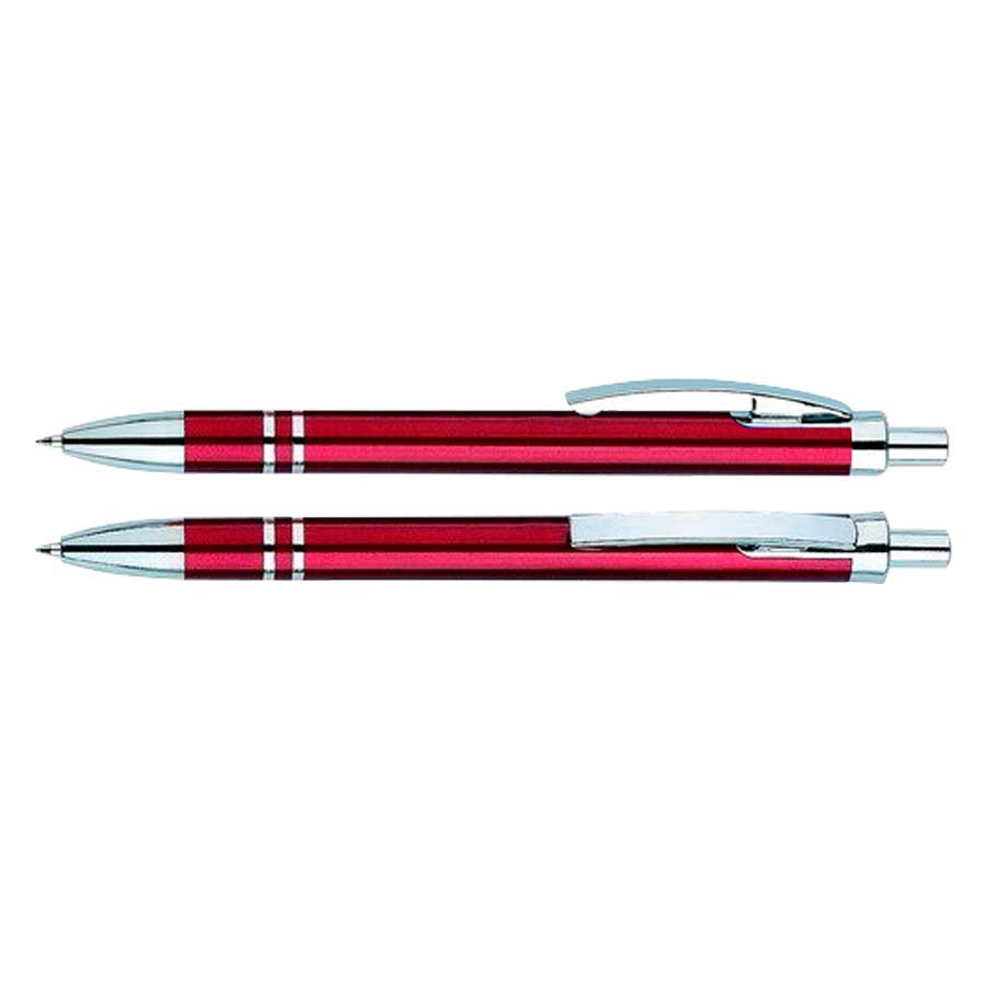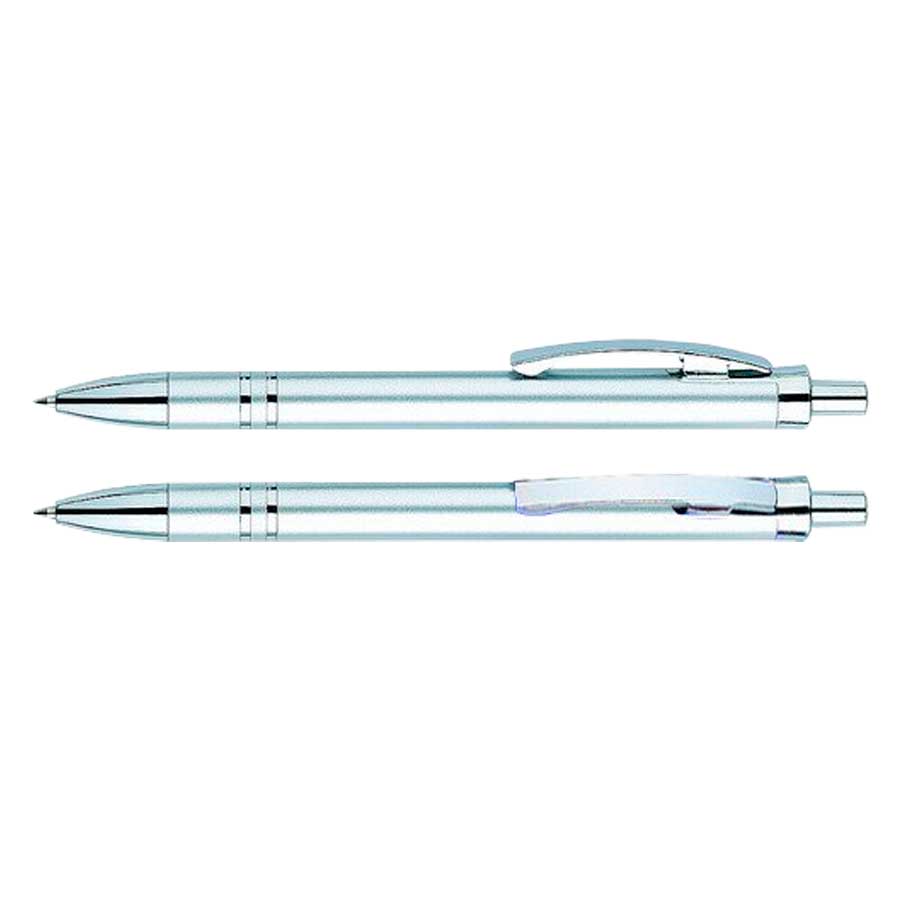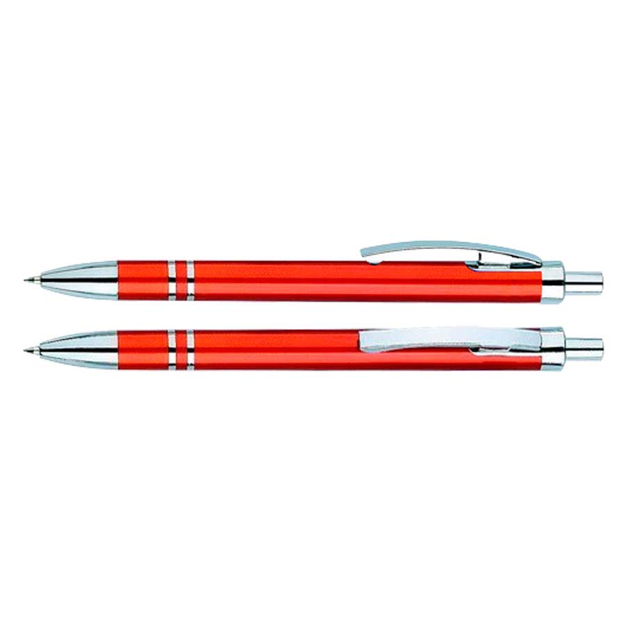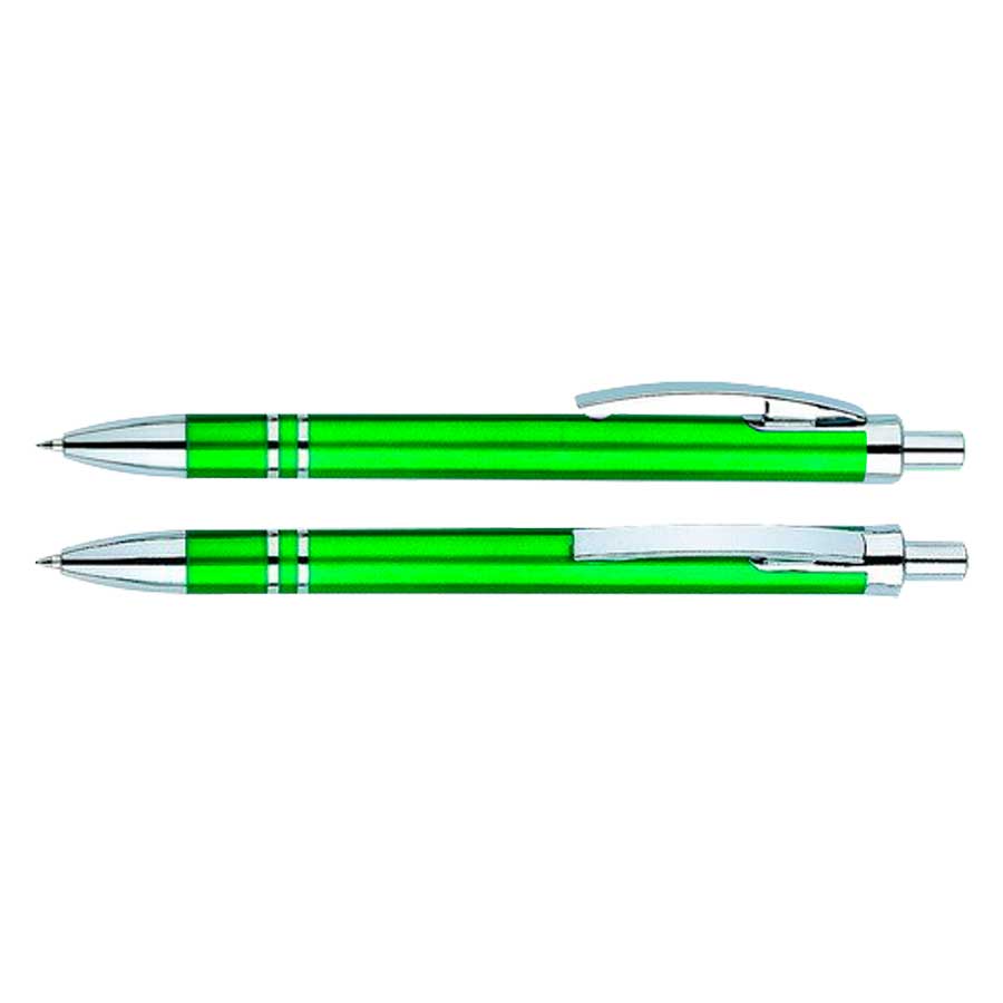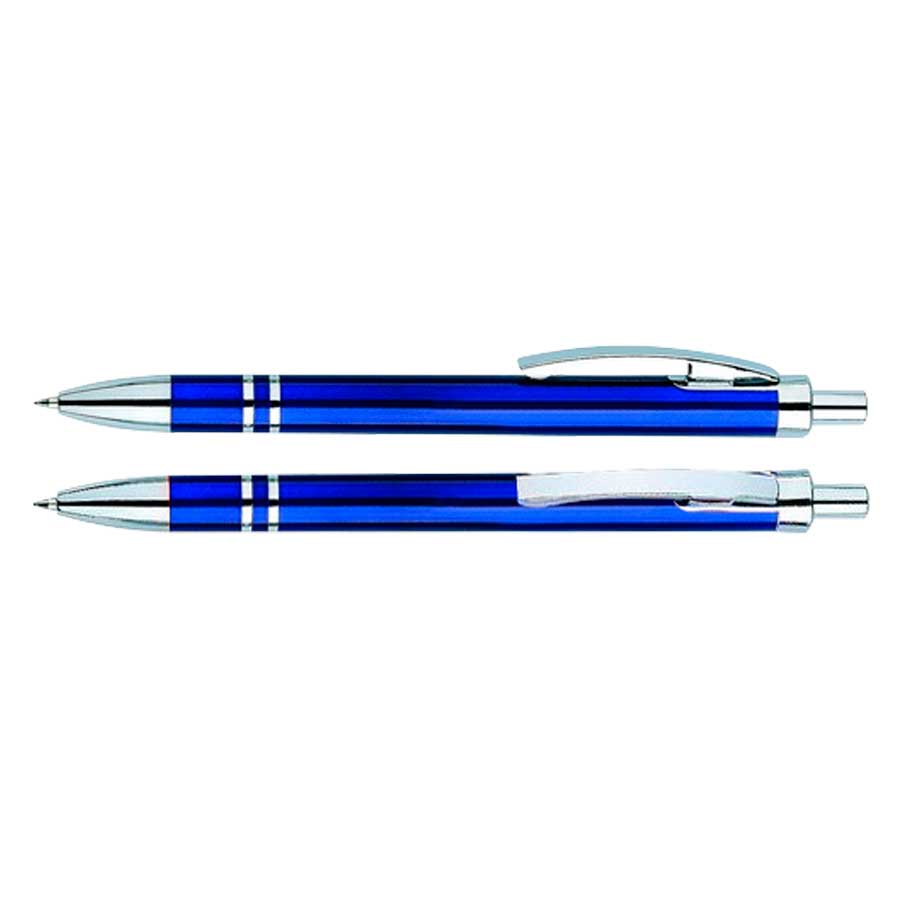 Bolígrafo plástico "Arco" con cuerpo de color metalizado. Escritura azul.