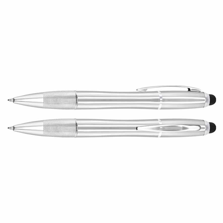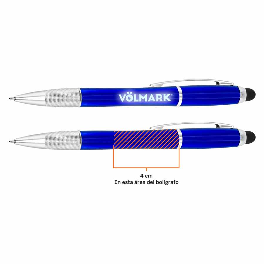 Bolígrafo plástico con puntero screen-touch al tono, modelo "NEON". Incluye luz LED al interior, para retroiluminar logo grabado sobre el cuerpo del bolígrafo. Escritura azul.