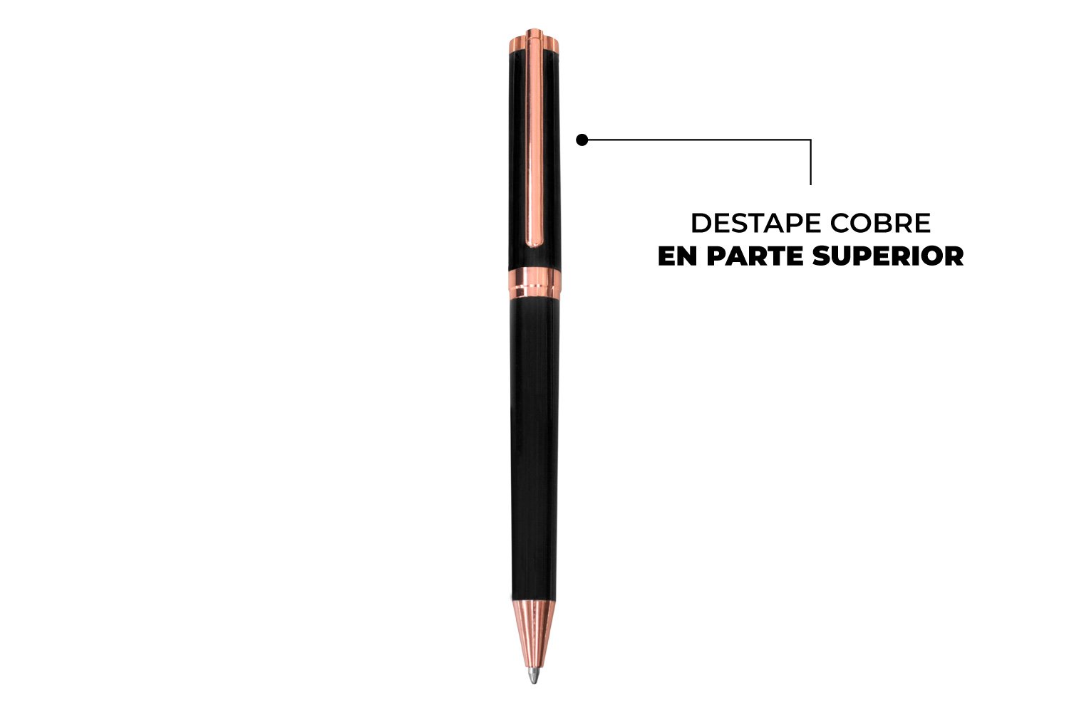 Metálico. Bolígrafo con apertura giratoria. Destape cobre en la parte de arriba. Cuerpo negro. Detalles en clip, arco circular y punta color cobre. Tinta negra. Presentación en estuche con cierre magnético.