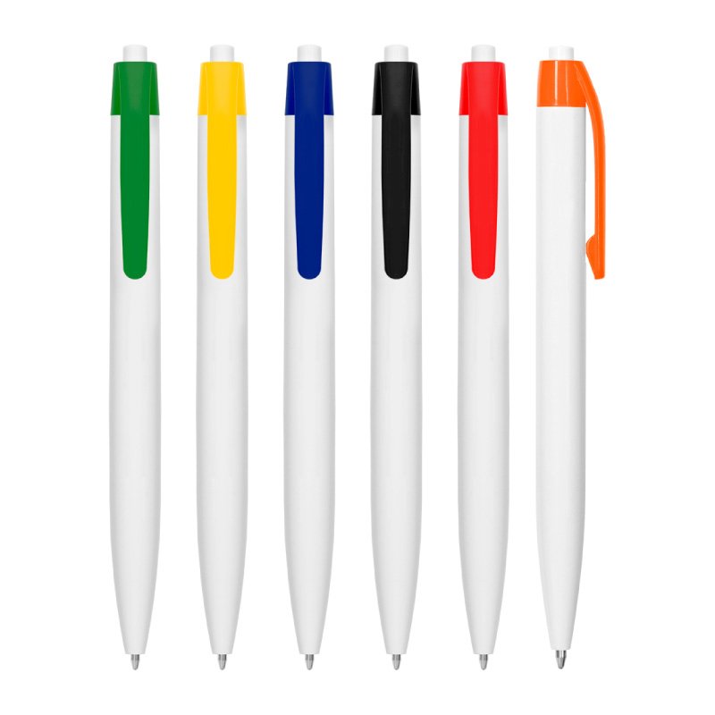 Plástico. Bolígrafo con pulsador. Cuerpo plástico de color blanco y clip de c...