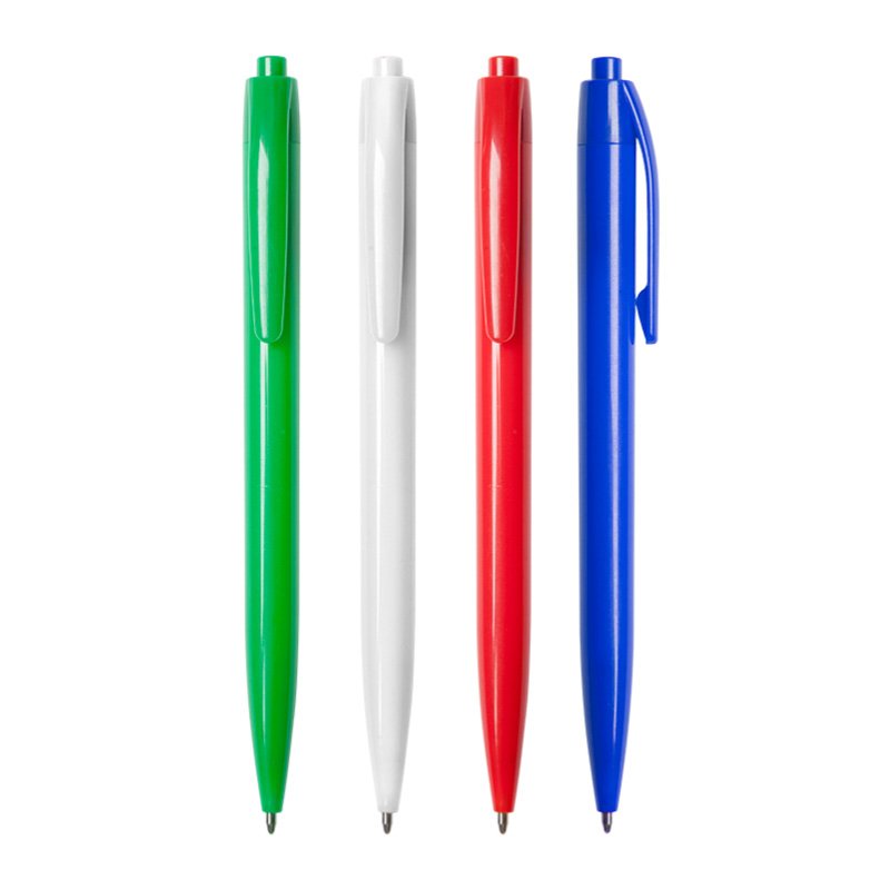 Plástico. Bolígrafo con cuerpo plástico de color con pulsador. Tinta azul.