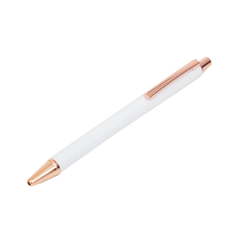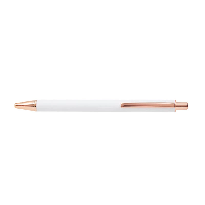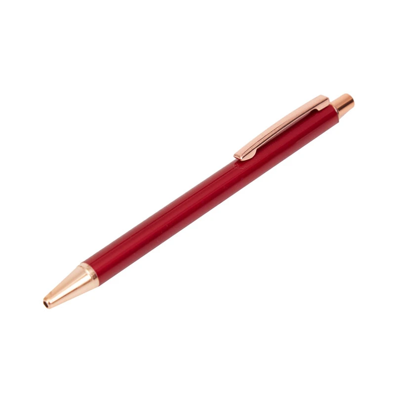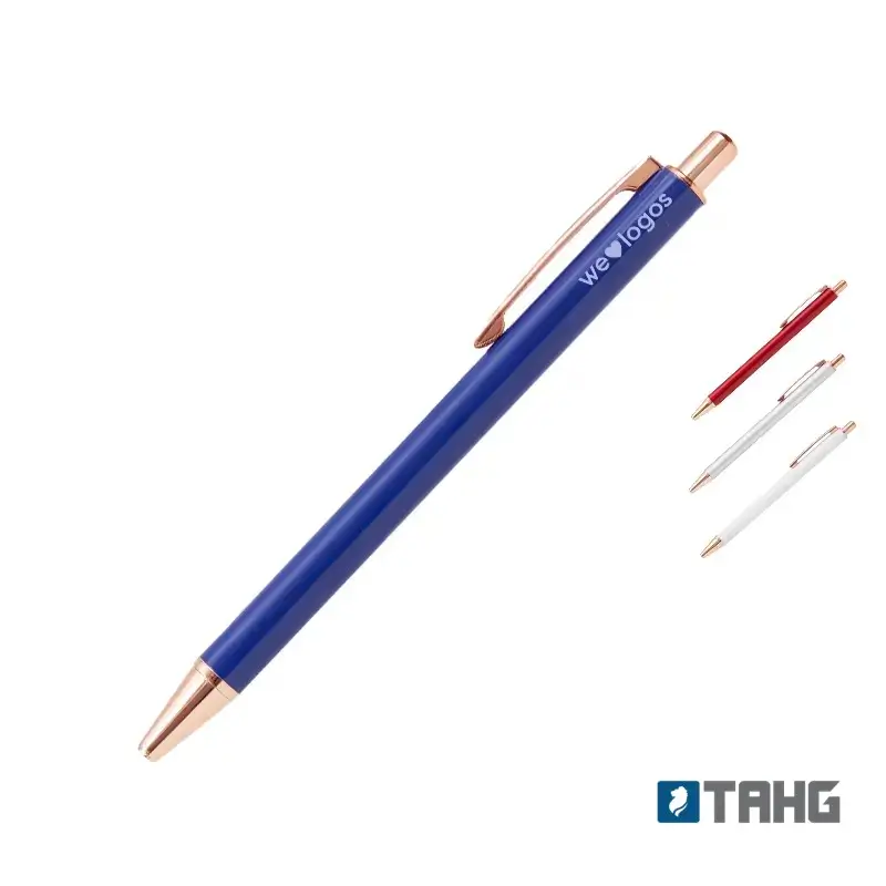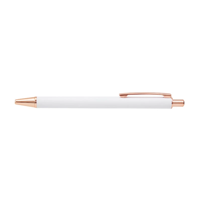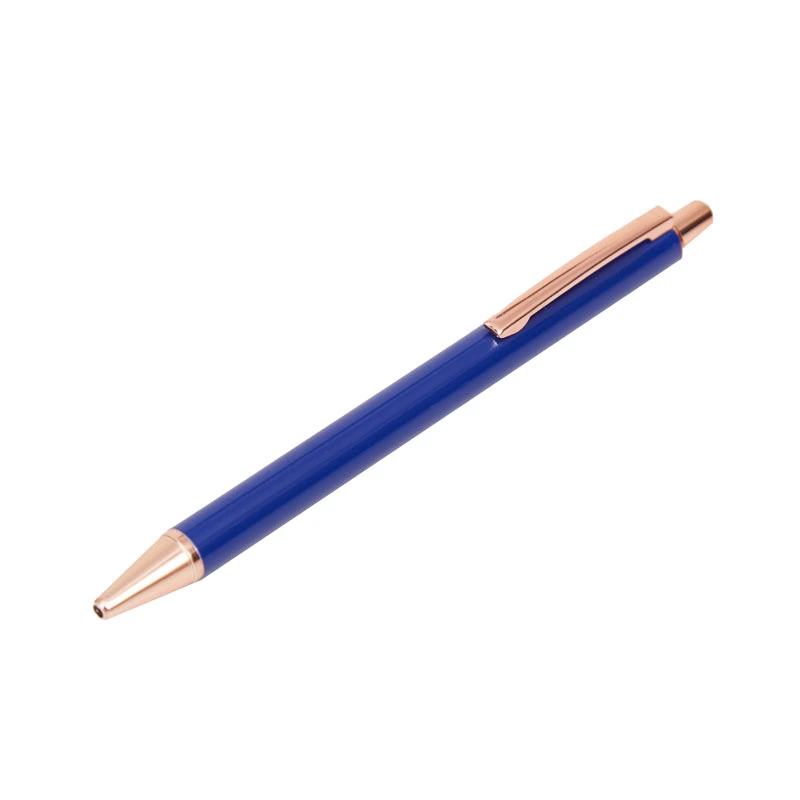Lápiz de cuerpo de aluminio con detalles en tono cobre. Tinta color azul. Sistema de apertura retractil