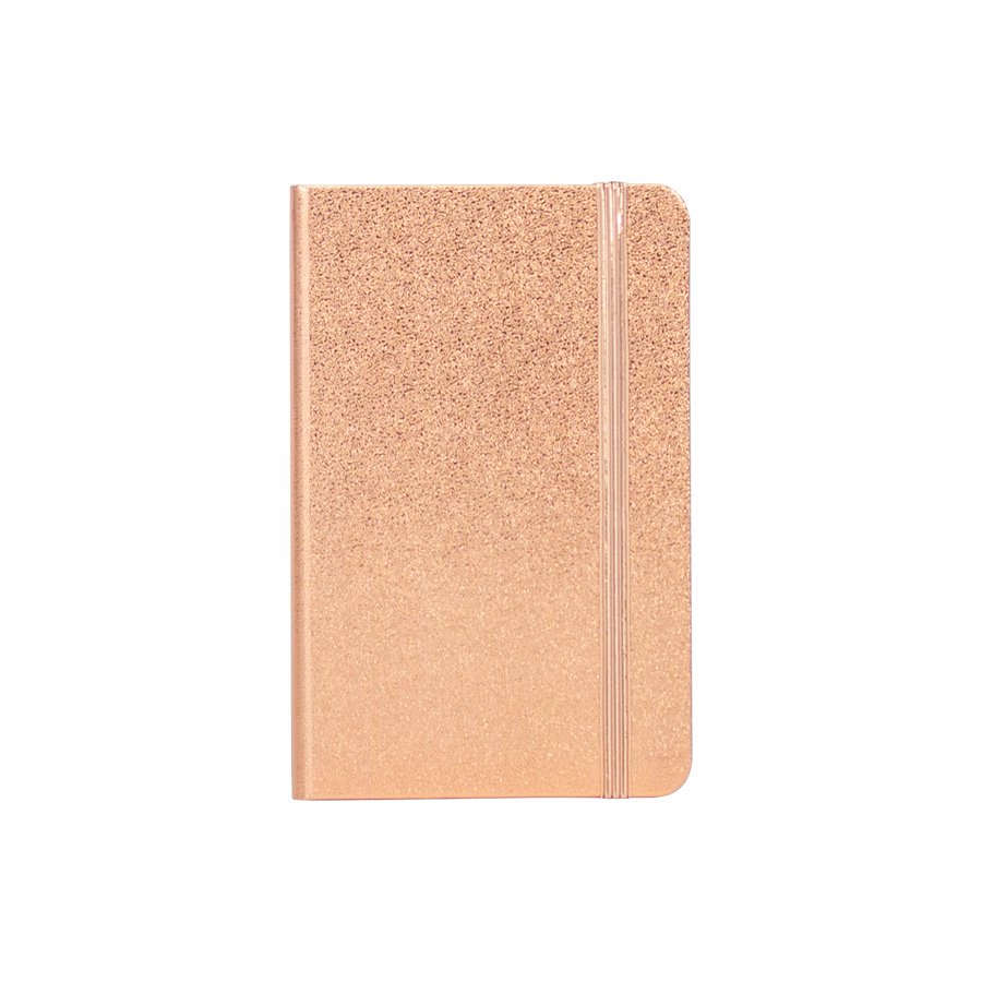 Libreta tamaño A6, con cubierta de cartón piedra forrada en PU color cobre de 1.5mm de espesor, interior 80 hojas amarillas lineadas de 80 gsm. Incluye banda elástica y huincha separador de hojas al tono. Presentación individual en bolsa de polipropileno translúcido.