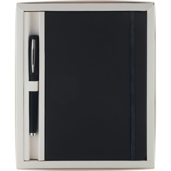 SK22 Set de libreta símil cuero negra y bolígrafo B40 negro en estuche blanco de presentación. Set de bloc de notas con tapas de suave tacto acabadas en polipiel y bolígrafo de suave cuerpo a juego. De 80 hojas lisas con elástico de sujeción y marcapáginas de tela. Presentado en elegante estuche de …