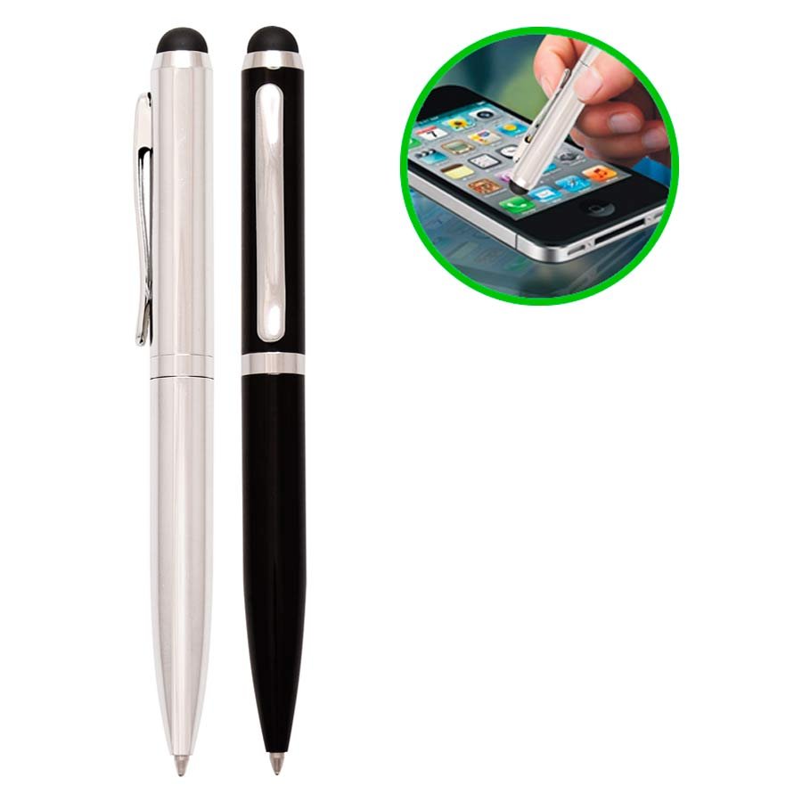 Bolígrafo Metálico modelo "Hotel", con goma posterior negra "Touch-Screen" para pantalla táctil. Escritura negra.