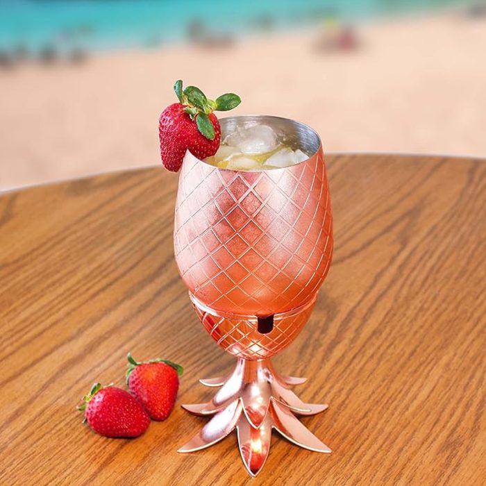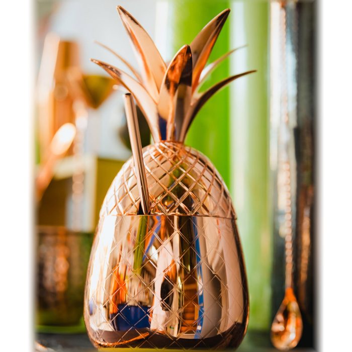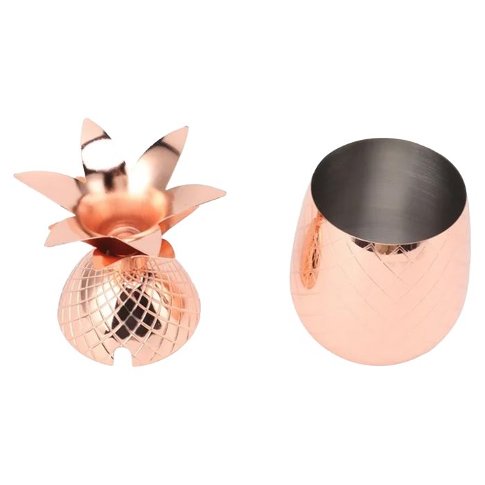 M93 Mug de acero inoxidable electro plateado en cobre en forma de piña. Presentación caja de cartón negro de 2 copas con cama de politileno extendido. Tamaño Piña Ø9,3 x 17,5 cms. Tamaño Bombilla Ø0,6 x 17 cms. Capacidad 250 ml. Material Cuerpo Acero Inox. SS 304 Material Tapa Zamak Embalaje 1 unid.…