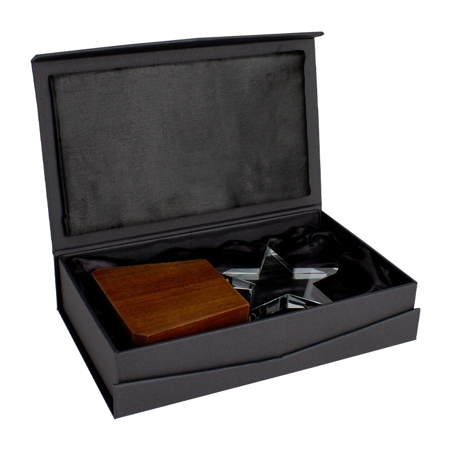 Elegante Trofeo modelo "Lonely Star", base de madera barnizada y estrella de cristal en su parte superior. Presentación en caja de cartón forrado negro con cierre imantado, interior acolchado de espuma y tela poliéster satinado negro, con troquel.