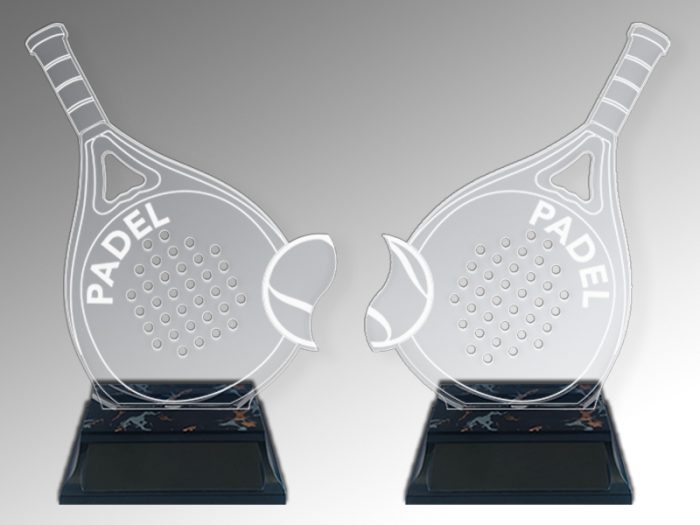 Trofeo Pádel contorno acrílico 8mm. + base plástica marmoleada. Trofeo consiste en dos piezas que se unen. Precio corresponde a trofeo completo (ambas piezas). Tamaño Dimensiones A 25 cm. x 36 cm. (Ambas piezas). 591077105